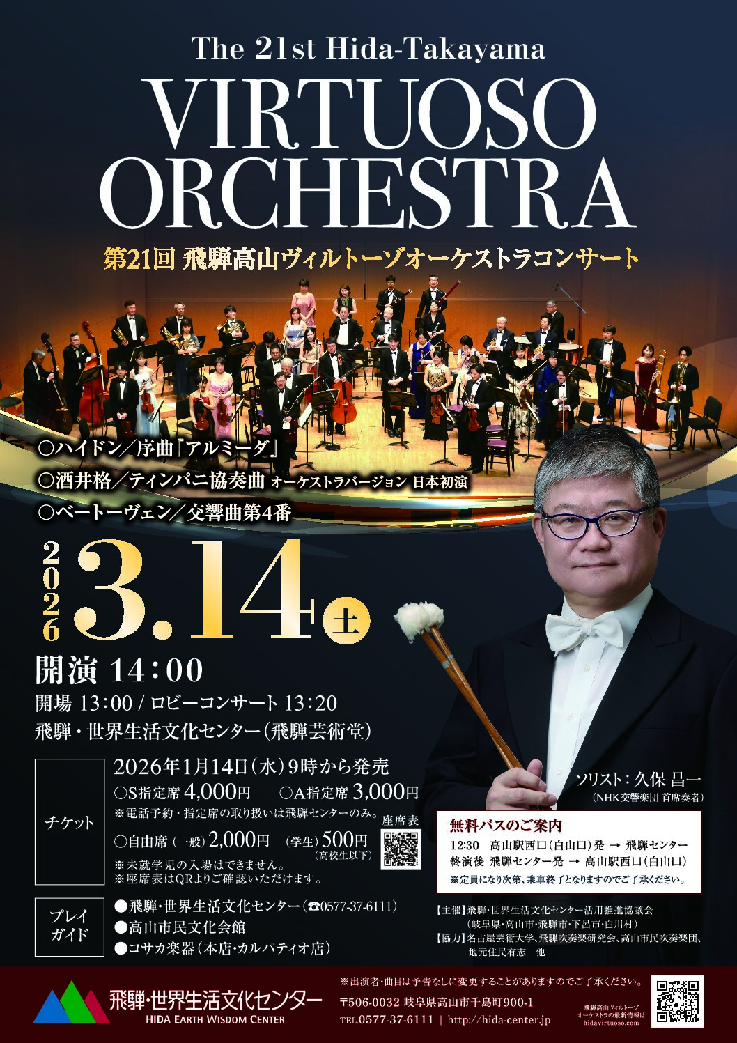 「第21回 飛騨高山ヴィルトーゾオーケストラコンサート(2026)」 開催日時 :2026年3月14日(土) 会 場 :飛騨・世界生活文化センタ…